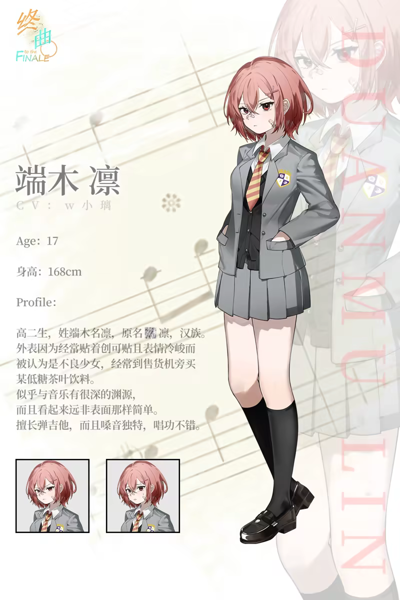 在梦想边缘挣扎的白石,偶然与神秘少女相遇,白石为她的歌声所打动。他萌生了一个大胆的想法——请求她为自己的歌曲演唱。 然而种种阻隔,将这种可能性变得渺茫。 继续坚持,抑或回到正轨? 被谜团包围的孤僻少女,矛盾重重的青梅竹马,认真而笨拙的学妹。 三个破碎的家庭,两条截然不同的道路,一声向着天空与未来的呐喊。 《终曲。》将以迷茫徘徊,而又无不令人惊喜的青春作为底色,为玩家讲述一段始于迷路孩子相遇的故事。 …… 所以—— “你能陪我就这样,一直走下去,直到终点吗?”
